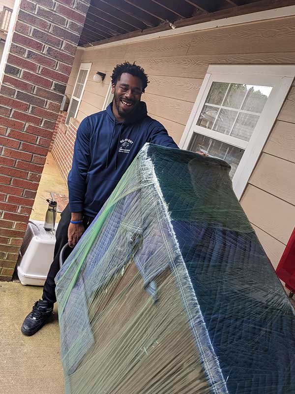 A smiling No Sweat Services Inc. mover stands outside a home with a large furniture item wrapped in moving blankets and plastic wrap on a dolly.