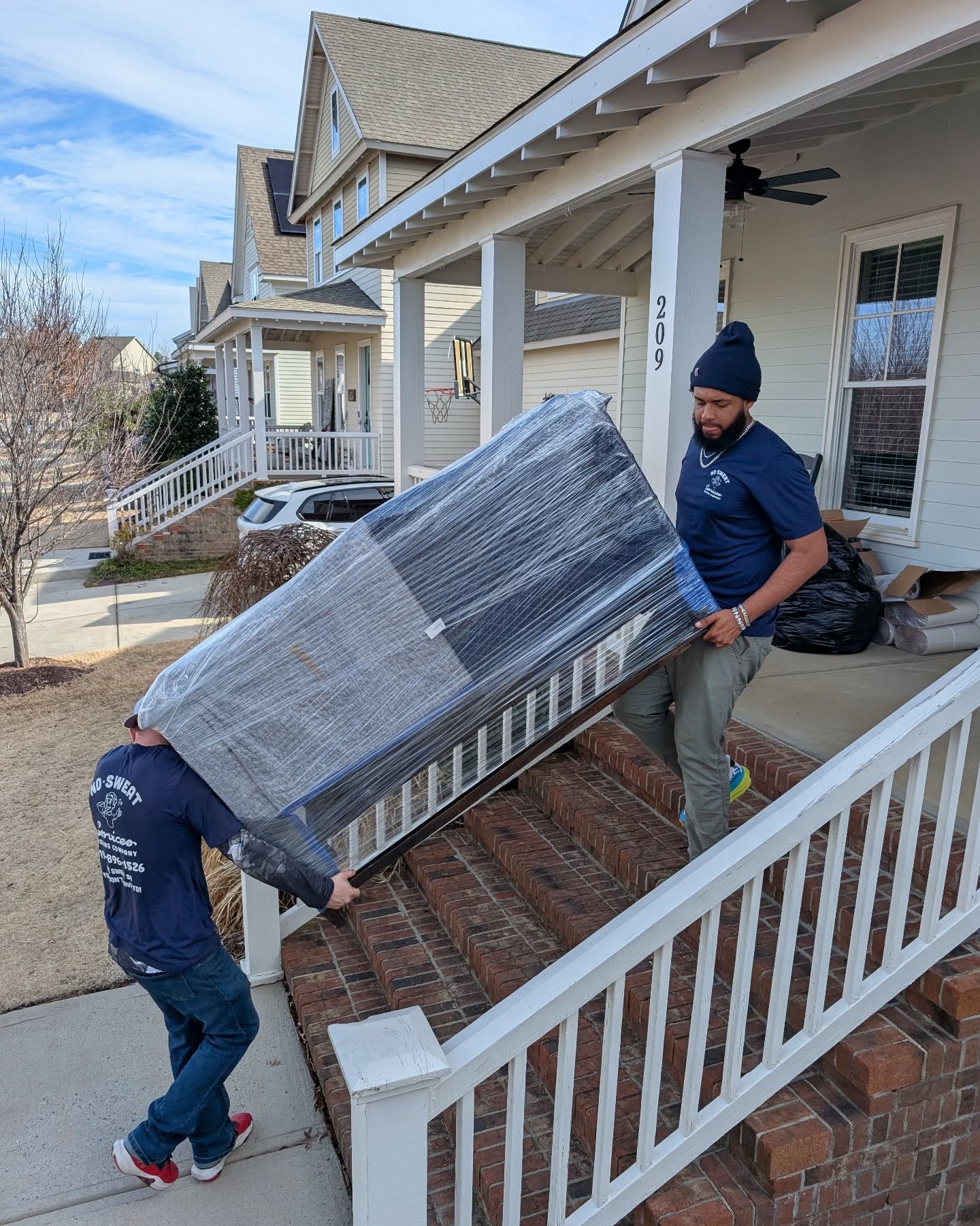 Two No Sweat Services Inc. movers carry a large, shrink-wrapped piece of furniture up a brick staircase into a home. One mover is lifting from the bottom, and the other guides from the top.