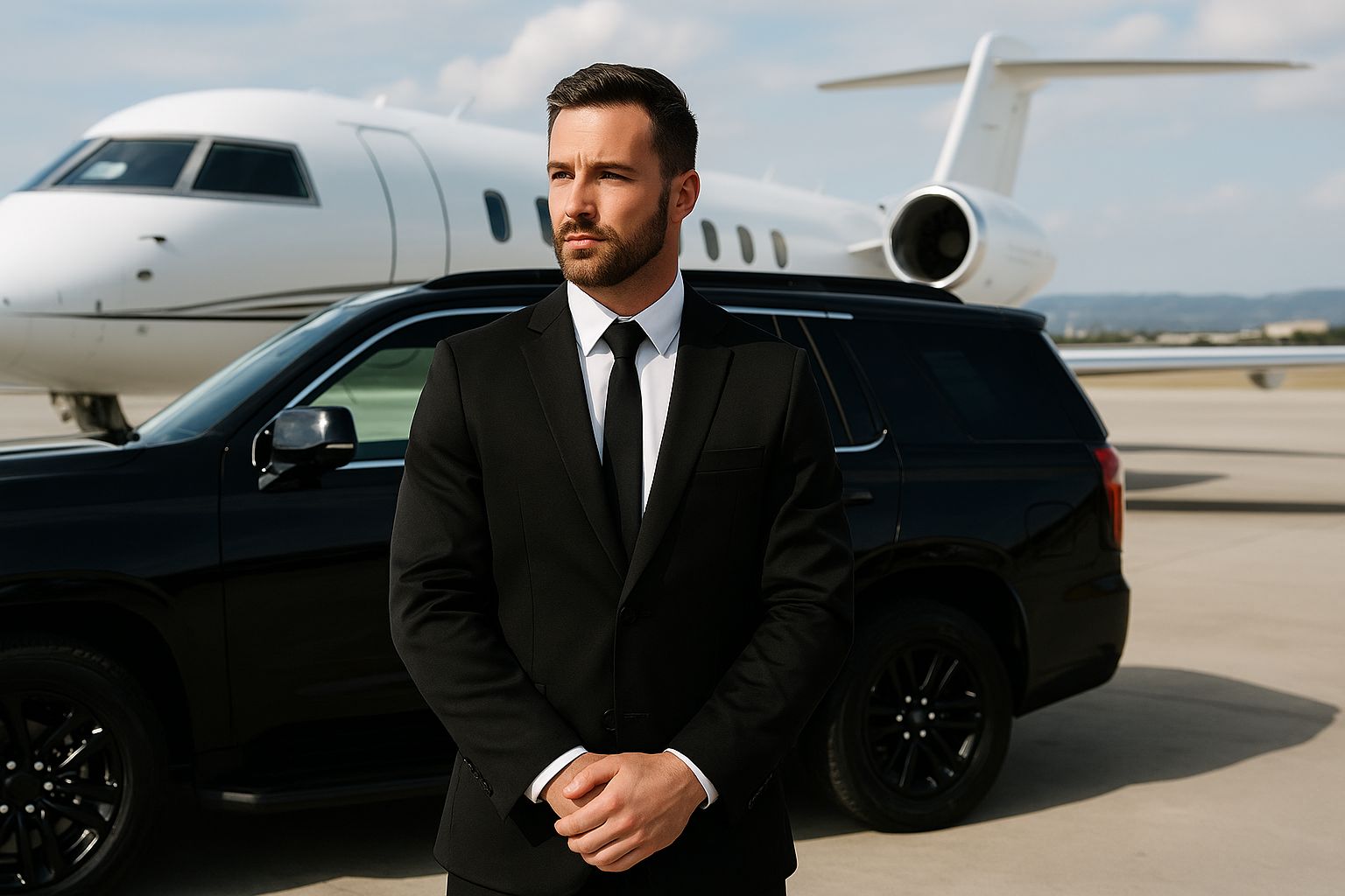 A professional chauffeur from Richline Transportation standing beside a luxury SUV at a private jet terminal in San Diego.