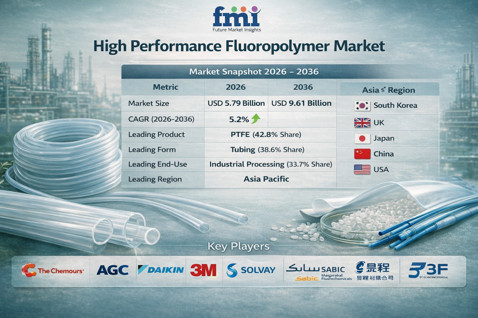 The market size in 2026 is USD 5.79 billion and is expected to reach USD 9.61 billion by 2036, growing at a CAGR of 5.2%. PTFE leads by product with a 42.8% share, tubing leads by form with 38.6% share, and industrial processing dominates end-use at 33.7%. Key regions driving growth include Asia Pacific, North America, and Europe, with major players such as The Chemours Company, Asahi Glass Co. Ltd., and Daikin Industries Ltd.