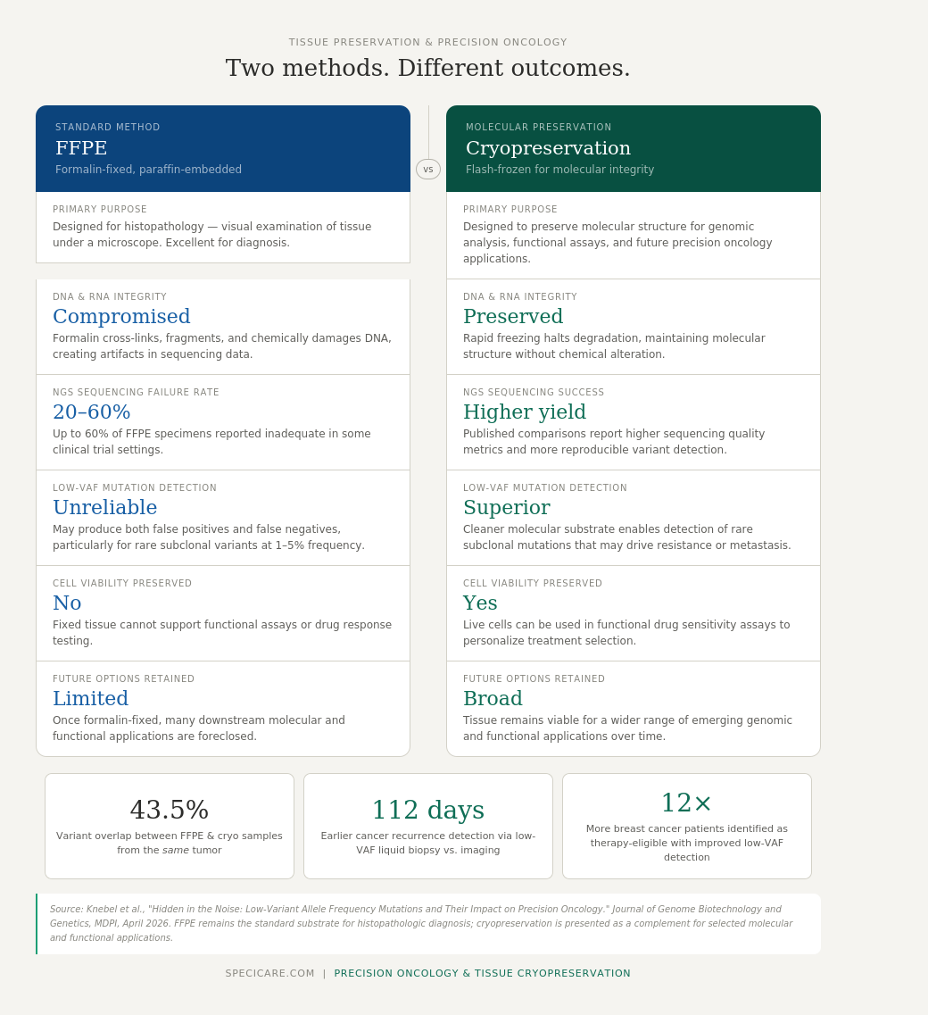 Specicare's own previously published matched-pair study found that when comparing cryopreserved and FFPE tissue samples from the same patient's tumor, only 43.5 percent of detected genetic variants overlapped between the two preservation methods. The paper discusses the implications of that discordance — including the possibility that FFPE-based sequencing may both miss real variants and generate artifactual ones — while acknowledging that additional research is needed to clarify the full clinical significance of these findings.