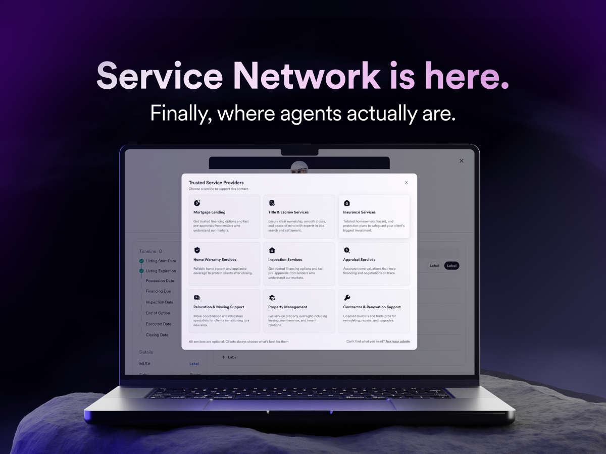 At the center of Service Network is brokerage control. Operators define which providers appear and how they are positioned. Agents can choose when to introduce to their clients. This gives leadership real visibility into service engagement while helping agents deliver a consistent experience for clients.
